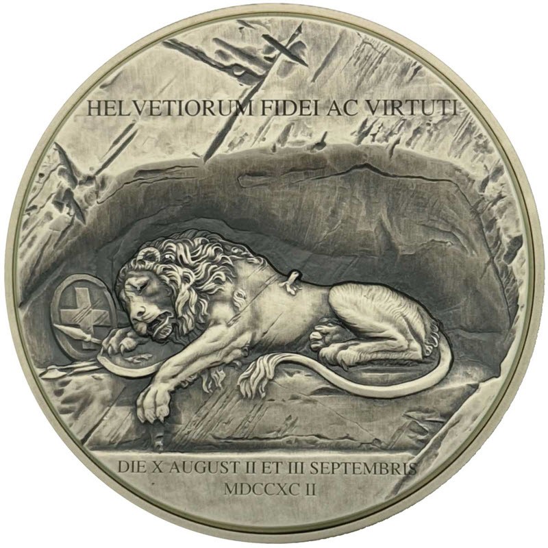 Deze unieke munt is geproduceerd met behulp van PMC's innovatieve Bi-Metal Max technologie, waarbij één ounce zilver wordt gecombineerd met vijf ounce koper. Op de achterkant staat een stervende leeuw afgebeeld met zijn kop gebogen over een schild met een lelie, een symbool van de Franse monarchie. Boven het tafereel staat het Zwitserse wapen, dat de moed en loyaliteit van de Zwitserse Garde voorstelt. De munt is uitgegeven ter gelegenheid van de 200e verjaardag van de onthulling van het monument, dat is opgericht ter nagedachtenis aan de helden die sneuvelden bij de verdediging van het Tuilerieënpaleis tijdens de Franse Revolutie. De munt is geslagen in gepolijste plaat, wordt geleverd in het originele doosje en gaat vergezeld van een echtheidscertificaat. De oplage is wereldwijd beperkt tot 300 stuks.