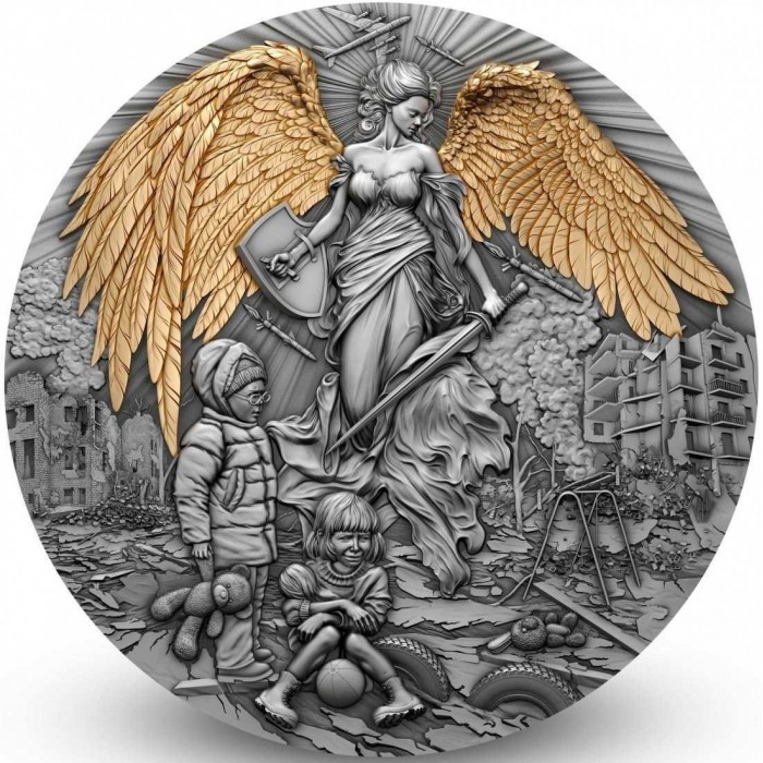 Deze prachtige zilveren munt van 2 ounce belichaamt het beeld van een beschermengel - een hemelse beschermer die mensen beschermt tegen kwaad en lijden. Op de achterkant staat een engel afgebeeld met een zwaard en schild, die kinderen beschermt tegen onheil. Het indrukwekkende reliëf, de prachtige vergulding en de antieke afwerking creëren een opvallend gevoel van diepte en licht. De munt is uitgegeven in een gelimiteerde oplage van 500 stuks wereldwijd en wordt geleverd met een certificaat van echtheid.