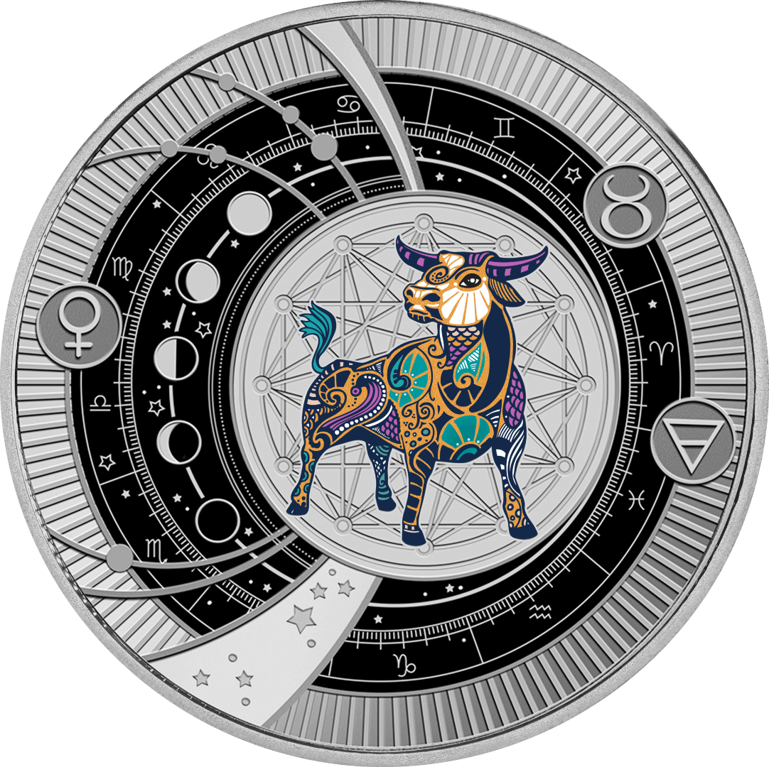 Deze elegante zilveren munt maakt deel uit van de serie "Dierenriemtekens" en is opgedragen aan Stier - een symbool van standvastigheid, trouw en een diepe verbondenheid met de natuur. De achterkant toont een majestueuze stier omringd door kosmische en astrologische symbolen, waaronder maanfasen, het teken Venus en sterrenbeelden. De munt is geslagen in gepolijste plaat en bevat ingewikkelde details die de harmonieuze en zelfverzekerde aard van Stier benadrukken. Dankzij de elegante hangerring kan de munt als sieraad worden gedragen en komt de schoonheid overal tot uiting. De munt wordt geleverd in een etui met een echtheidscertificaat en is wereldwijd gelimiteerd tot 599 exemplaren.