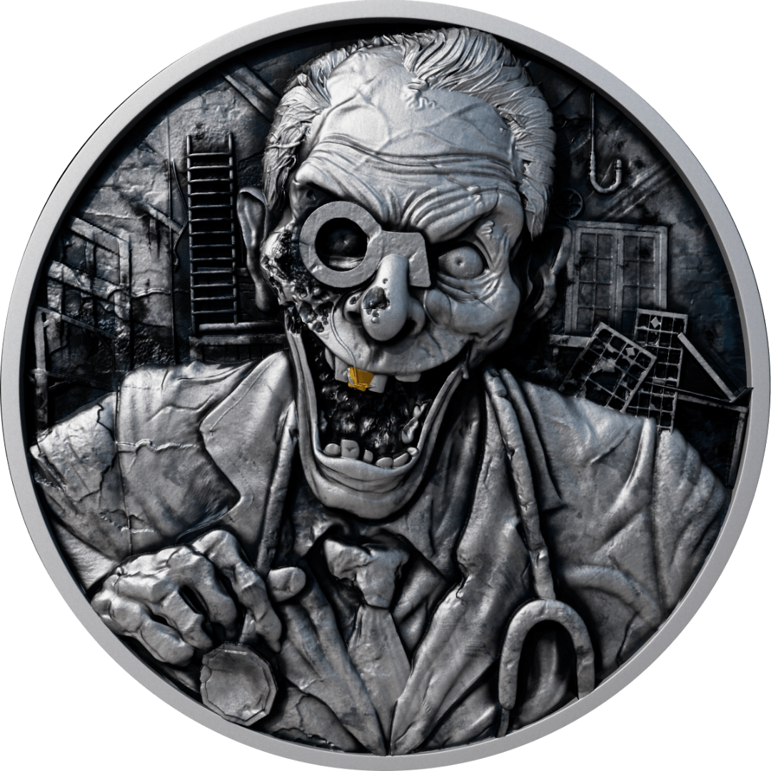 Deze griezelige en raadselachtige zilveren munt van 2 oz dompelt ons onder in de duistere en verontrustende wereld van psychiatrische inrichtingen, een plek waar de grens tussen rede en waanzin begint te vervagen. In het midden van de compositie staat een gestoorde dokter, zowel bewaker als beul, die het verwrongen gezicht van autoriteit belichaamt.