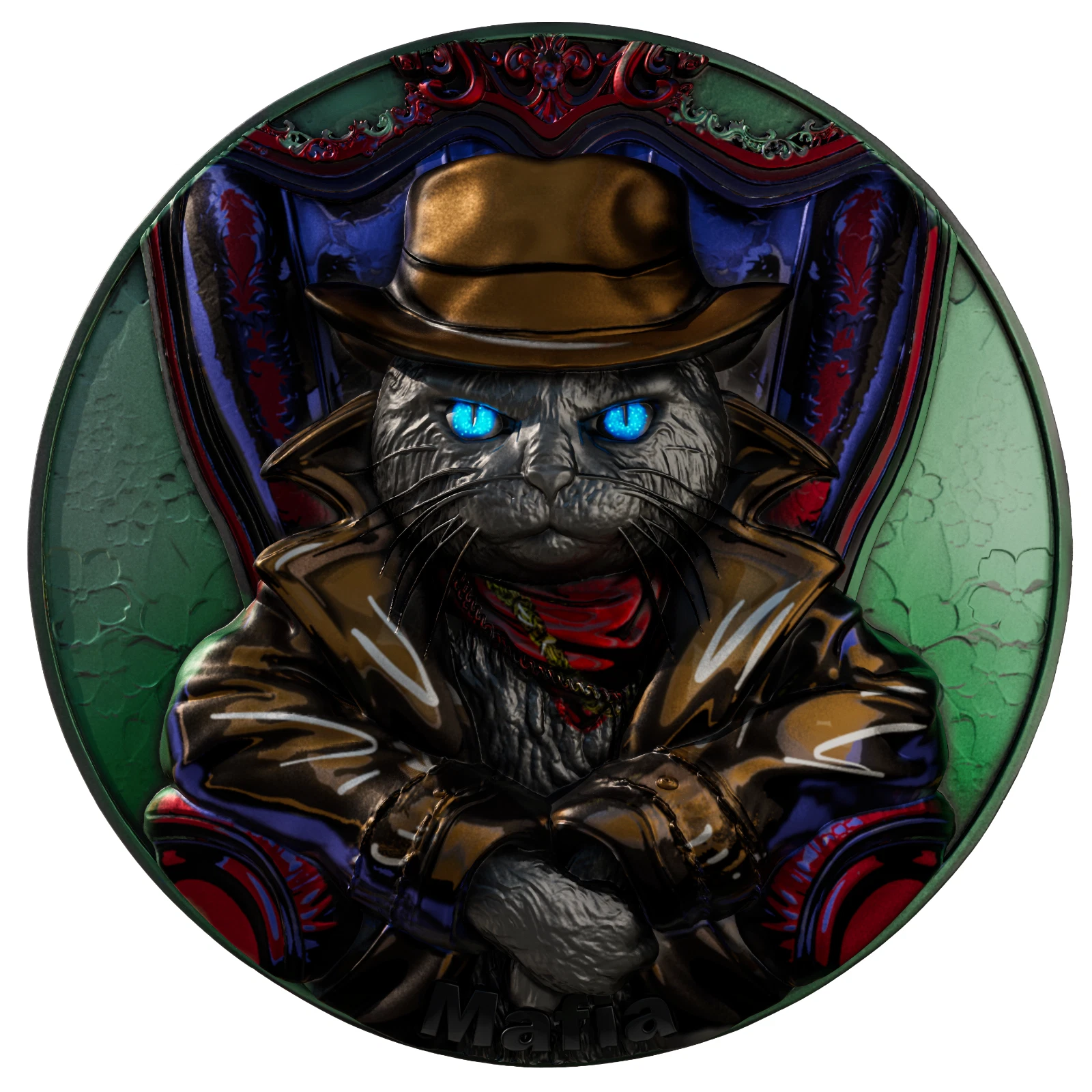 Deze indrukwekkende zilveren munt van 2 ounce is het begin van de "Meow" serie, gewijd aan de charismatische en gevaarlijke leden van de katachtige wereld. De achterkant toont een majestueuze katachtige maffiabaas, die zelfvertrouwen en koude superioriteit uitstraalt. Met vernauwde ogen, een schuine hoed en een commanderende houding straalt hij macht en ongetemd instinct uit. De munt heeft een antieke afwerking en een hoog reliëf dat elk detail van het ontwerp benadrukt. Een speciaal element gloeit in het donker en voegt zo een extra vleugje mysterie toe. De munt wordt geleverd in een stijlvol etui met een echtheidscertificaat en is wereldwijd gelimiteerd tot slechts 199 stuks.