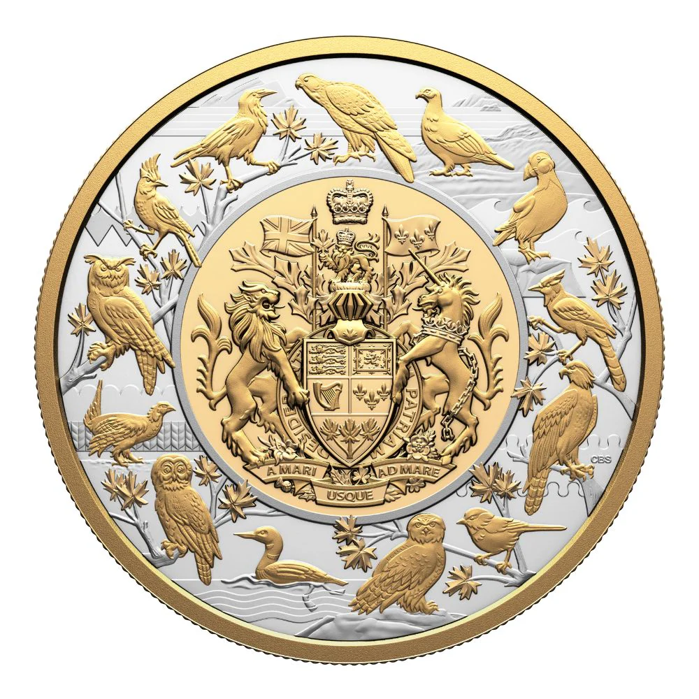 Deze indrukwekkende verzamelaarsmunt is geslagen uit 5 ounce puur zilver en verrijkt met een selectieve vergulding. Op de achterkant staat het nieuwe Canadese wapenschild, ontworpen door kunstenares Cathy Bursey-Sabourin, de officiële versie die nu in het hele land wordt gebruikt. Dankzij de grote diameter van 65 mm komen de ingewikkelde heraldische details volledig tot hun recht, waaronder een decoratieve rand met 13 provinciale en territoriale vogels, die een symbolisch en visueel rijk "landschap" van Canada vormen. Elke munt wordt gepresenteerd in een presentatiekoker van de Royal Canadian Mint met een echtheidscertificaat in serie. De oplage is beperkt tot 1.300 stuks.