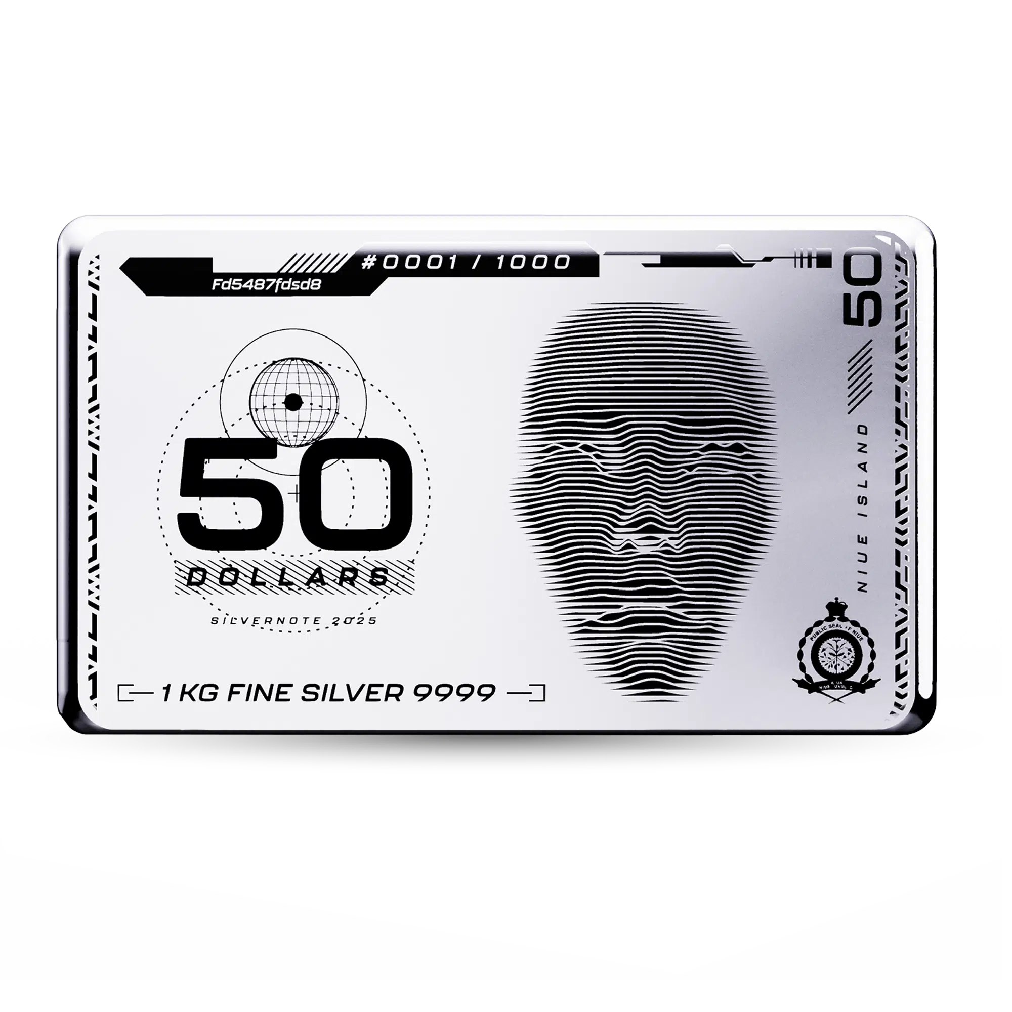 De 2025 Niue zilveren munt baar combineert het formaat van een bullion bar met de status van wettig betaalmiddel. De munt is geslagen uit 1 kg 0,9999 fijn zilver, heeft een nominale waarde van 50 NZD en is gelimiteerd tot slechts 1.000 stuks wereldwijd. Het rechthoekige formaat (93,5 × 58 mm, dikte 18,5 mm) versterkt de moderne en technische esthetiek. Het ontwerp bevat grafische elementen in veiligheidsstijl, serienummering en een gestileerd portret gevormd door dynamische lijnpatronen. Het vetgedrukte opschrift "50 DOLLARS" benadrukt de status van wettig betaalmiddel, terwijl "1 KG FINE SILVER 9999" de puurheid van de munt benadrukt. Met zijn hoge fijnheid, substantiële gewicht en beperkte oplage onderscheidt deze kilo-zilveren munt zich als een opvallende uitgave die zowel verzamelaars als serieuze beleggers in edelmetalen aanspreekt.