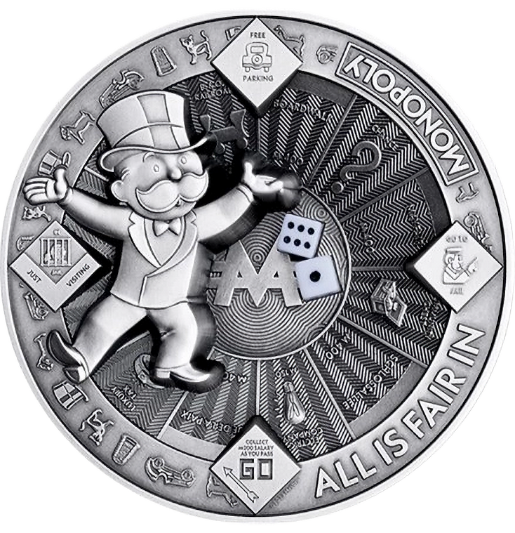 Deze prachtige zilveren munt van 10 oz herdenkt de 90e verjaardag van het iconische Monopolyspel dat families en vrienden over de hele wereld samenbrengt. De munt is geslagen in meerdere lagen waardoor een spectaculair 3D-effect ontstaat en wordt aangevuld met een echt 3D-bot. Het ontwerp toont de geliefde Mr. Monopoly en iconische spelbordelementen. De munt wordt geleverd in een demo-doosje met een echtheidscertificaat. De oplage is strikt beperkt tot slechts 250 exemplaren wereldwijd.