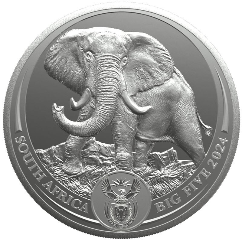 De Olifant 2024 is de eerste kilo uitgifte in de nieuwe Big Five III serie van de Zuid-Afrikaanse Munt. Deze indrukwekkende munt, geslagen uit 1 kilo (32,15 ounce) 0,999 fijn zilver in gepolijste plaat, heeft een denominatie van 5 rand en is wereldwijd gelimiteerd tot slechts 100 stuks. Elke munt wordt geleverd in de originele houten doos met een genummerd echtheidscertificaat. Deze uitgave vertegenwoordigt de tweede zilveren Olifant van 1 kilo. Op de voorkant staat een volslanke afbeelding van een volwassen Afrikaanse olifant, met de inscripties "SOUTH AFRICA", "BIG FIVE 2024" en het nationale wapen. De achterkant volgt het concept van de signature serie: twee helften van een olifantenkop vormen een compleet close-up portret wanneer twee munten op elkaar worden geplaatst. Meerdere munten naast elkaar creëren de visuele indruk van een hele kudde. In het midden staan "FIVE RAND", "1kg" en "Ag 999".